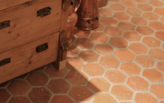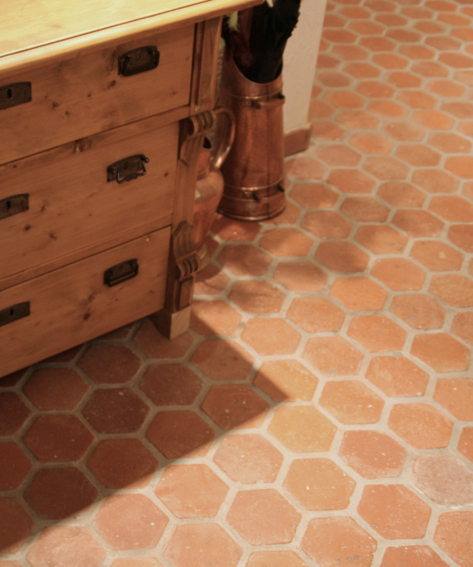 Un pavimento in cotto di recupero unico e accattivante, dalla singolare forma esagonale. Grazie alla loro origine autentica, le singole piastrelle differiscono per consistenza e colore, ma allo stesso tempo formano un insieme coerente. Con la sua forma insolita e i suoi colori naturali e caldi, il prodotto combina eleganza classica e modernità. Questo lo rende adatto a molti stili di design diversi. La terracotta è molto resistente, durevole, ha un’eccellente capacità di accumulare calore e non presenta bordi taglienti o sostanze nocive nella sua composizione, il che la rende molto sicura e comoda da usare. Per mantenerlo pulito, sono sufficienti i metodi tradizionali come il lavaggio e l’aspirapolvere. Con l’impregnazione, il pavimento è protetto da sporco, olio e umidità.